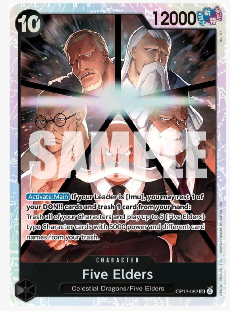 [Activate: Main] If your Leader is [Imu], you may rest 1 of your DON!! cards and trash 1 card from your hand: Trash all of your Characters and play up to 5 "Five Elders" type Character cards with 5000 power and different card names from your trash.